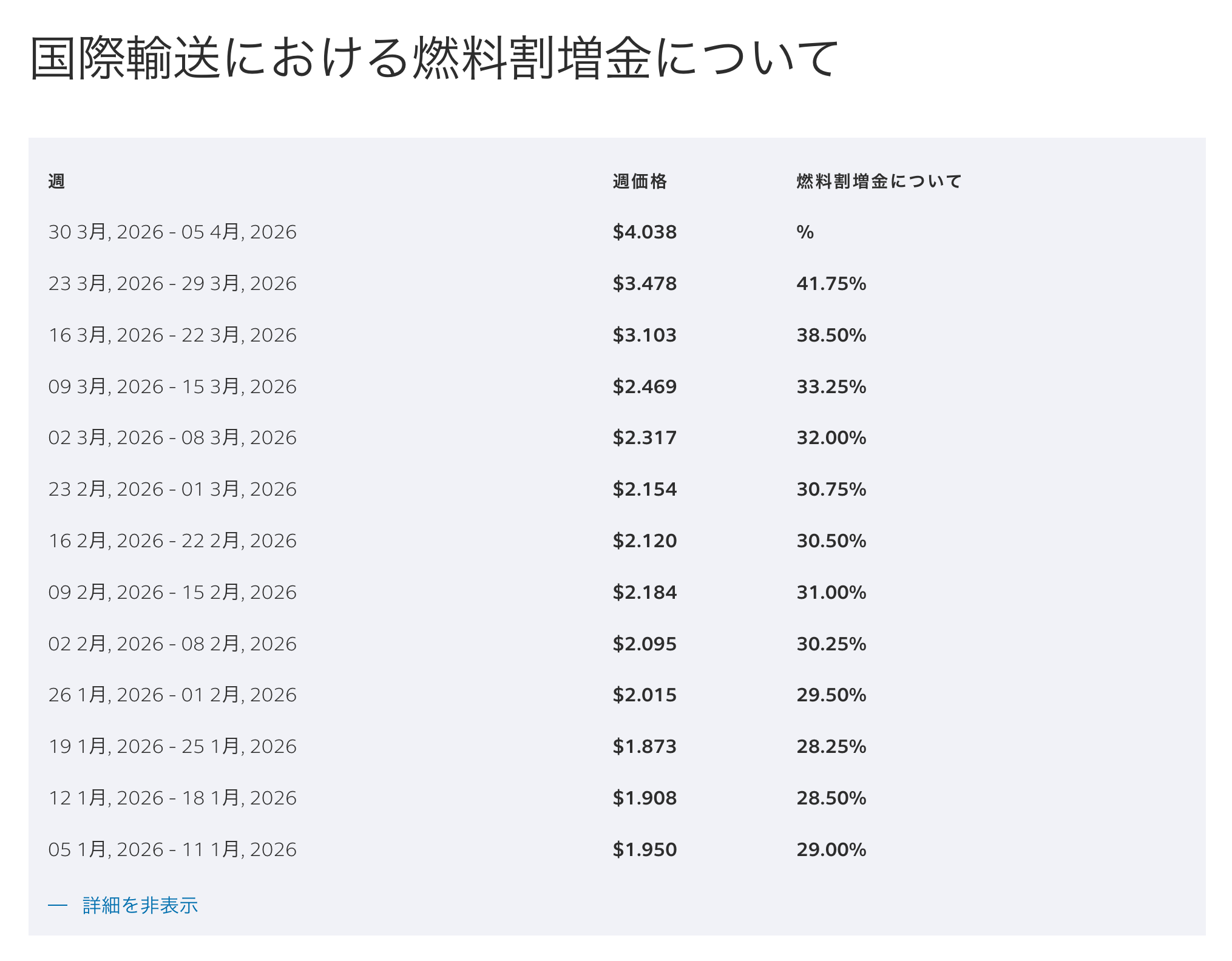 FedExの燃料サーチャージ、来週分が%表示が出てないのでサポートに連絡して聞きましたが、46.25%らしいです。